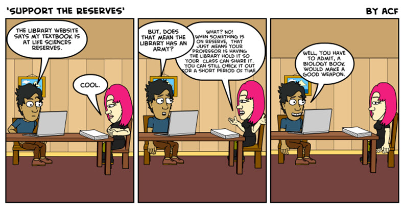 Course reserves are a collection of class materials that instructors have requested be available for checkout, like copies of a specific textbook. These are kept at the front desk.